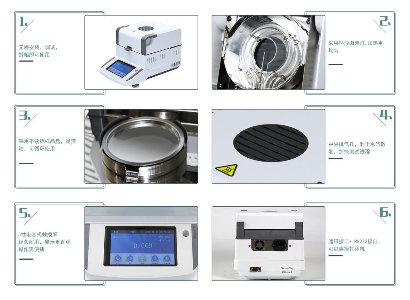 8.設計優(yōu)良獨特溫控加熱系統(tǒng)結果更精準,實時曲線圖顯示,直觀觀察水分變化;