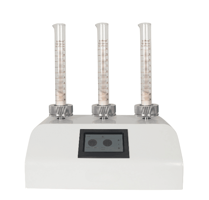 將定量的粉末置于量筒中,在保持顆粒原始形態下,通過振動裝置均勻往復的上下直線運動,使顆粒間隙趨于一極限值,直到粉末的體積不再減小為止。粉末的質量除以振實后的體積,得到的就是樣品的振實密度。
